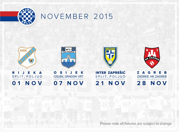 By the end of the month, Hajduk plays another two First League rounds: a home match against NK Inter Zapresic (on 21 November 2015) and an away match in Zagreb, against NK Zagreb (on 28 November 2015).