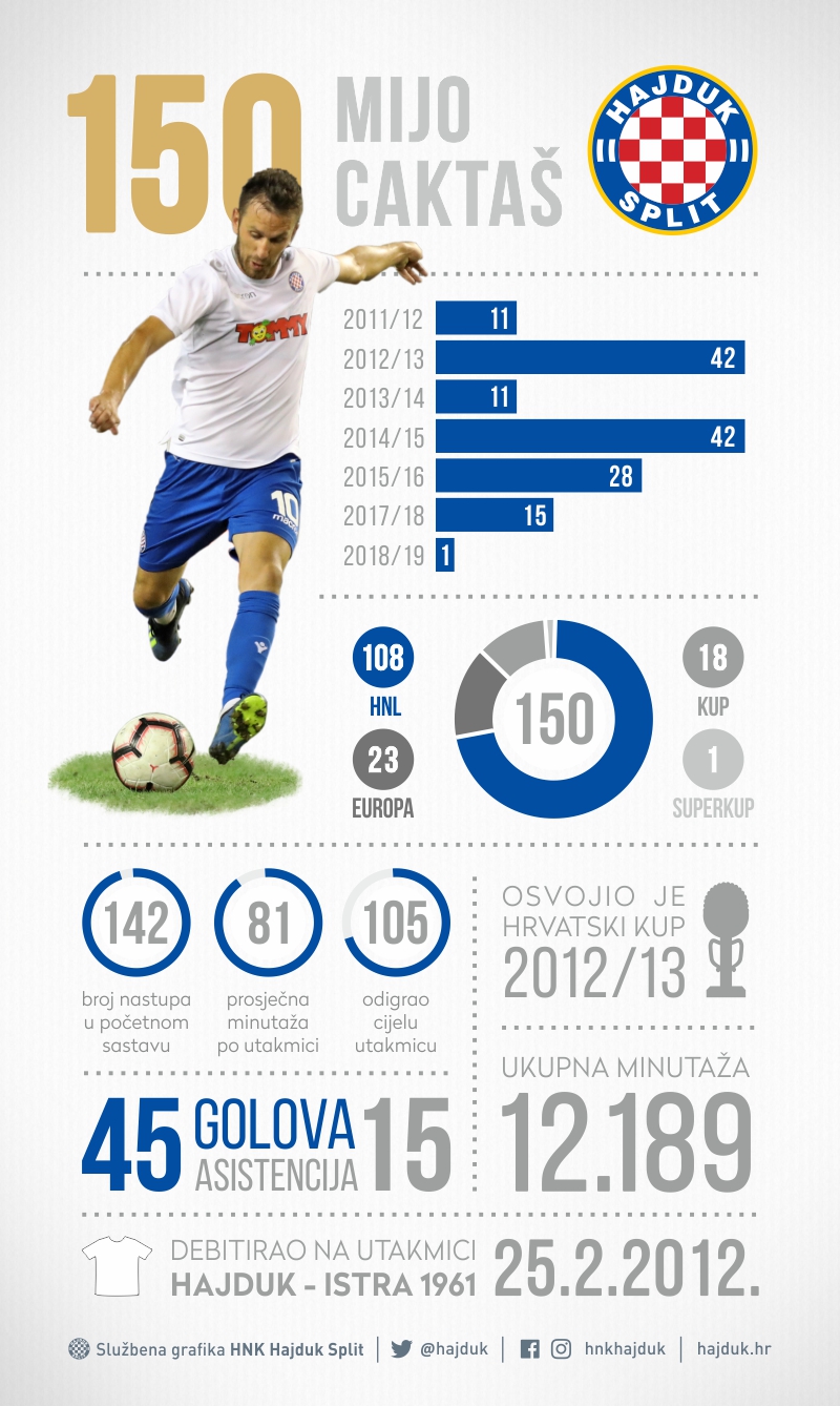 Sto pedeseti nastup u bijelom dresu upisao je Mijo Caktaš u jučerašnjoj utakmici 2. pretkola kvalifikacija za Europsku ligu u kojoj je Hajduk s 1:0 svladao Slaviju iz Sofije.