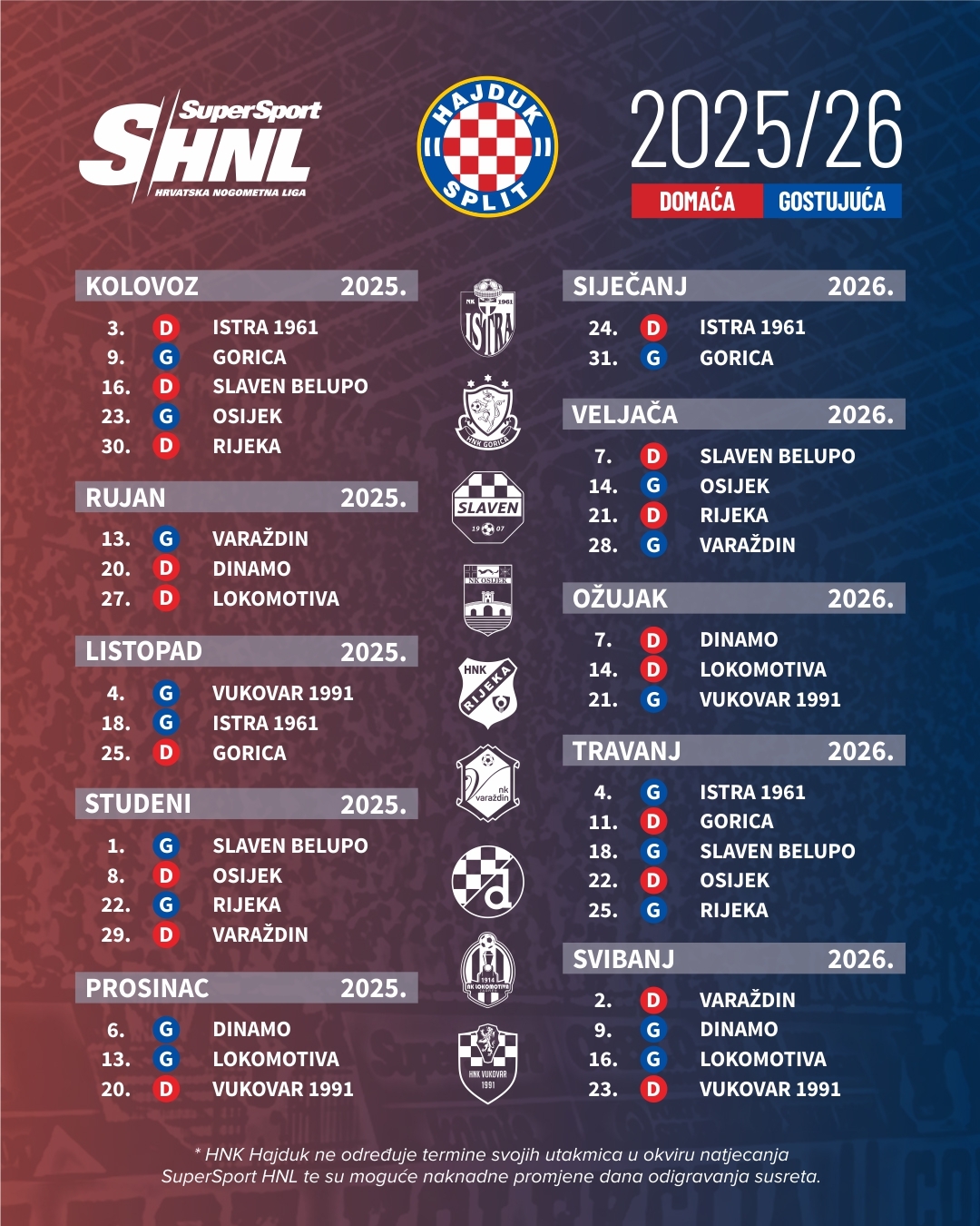 HNK Hajduk ne određuje termine svojih utakmica u okviru natjecanja SuperSport Hrvatske nogometne lige te su moguće naknadne promjene dana i sata odigravanja susreta.