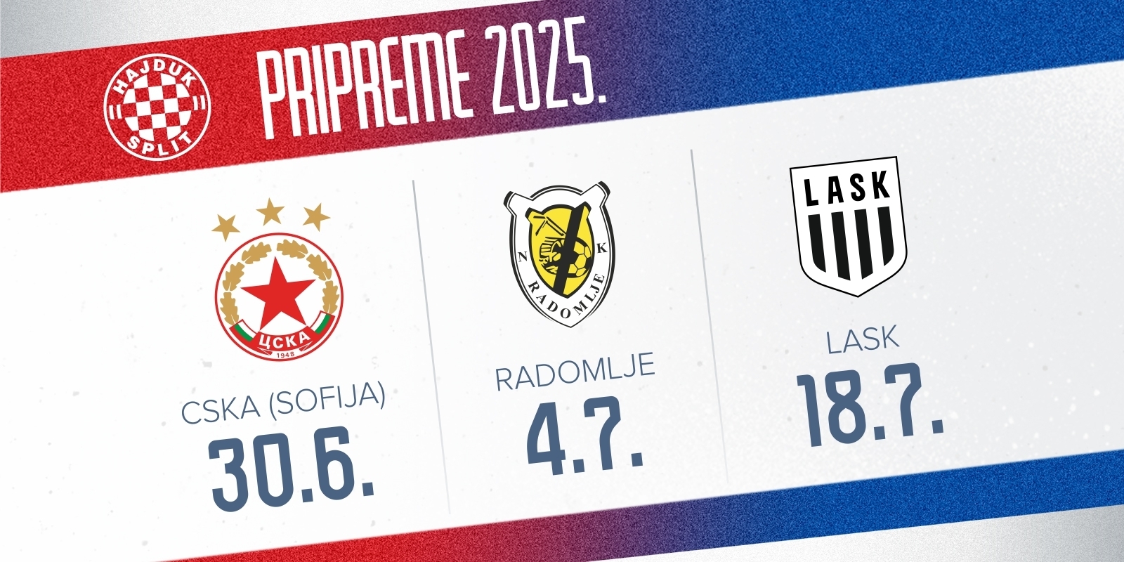 Do 27. lipnja hajdukovci će trenirati u Splitu, a zatim odlaze u Bled u Sloveniji gdje će odraditi središnji dio priprema. U Bledu će se Bijeli zadržati do 4. srpnja te će u okviru slovenskog dijela priprema odigrati dvije prijateljske utakmice. U prvoj će odmjeriti snage s bugarskim CSKA iz Sofije 30. lipnja, a u drugoj sa slovenskim Radomljem 4. srpnja.