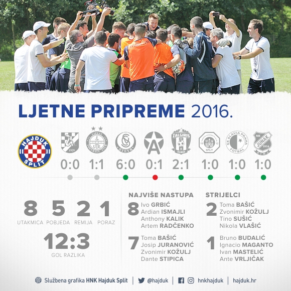 Hajdukovci su vrlo uspješno kompletirali ljetne pripreme. Momčad Marijana Pušnika odigrala je 8 prijateljskih utakmica i pritom ostvarila učinak od pet pobjeda, dva neriješena rezultata i jednog poraza.