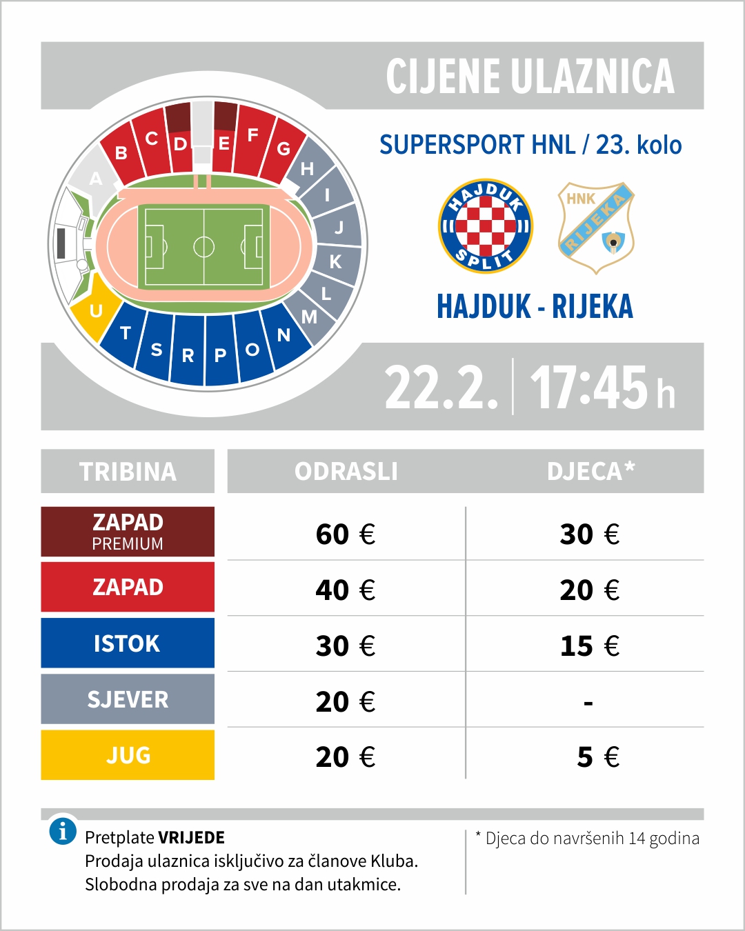U ponedjeljak u 10 sati kreće prodaja ulaznica za utakmicu 23. kola SuperSport HNL, Hajduk - Rijeka, koja će se odigrati u subotu 22. veljače s početkom u 17.45 sati na Poljudu. Kao i do sada, do dana utakmice pravo kupnje imaju isključivo aktivni članovi Kluba.