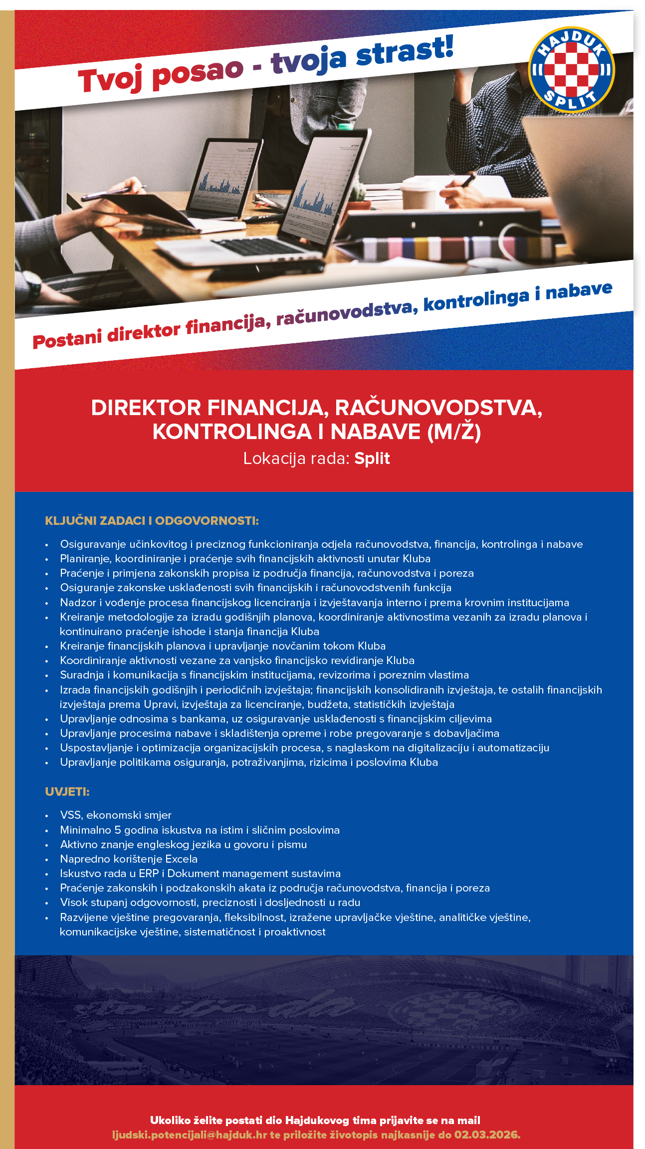Uprava HNK Hajduk s.d.d., VIII. Mediteranskih igara 2, Split, dana 20. veljače 2026. godine raspisuje natječaj za radno mjesto "direktor financija i računovodstva, kontrolinga i nabave".