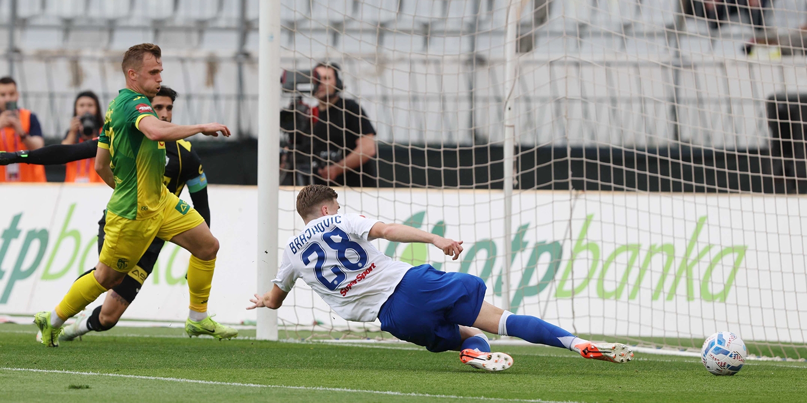 31 Prilika za Hajduk. Melnjak je prošao po lijevom krilu, zatim je poslao oštar, prizeman ubačaj na drugu stativu, a Brajković je sekundu zakasnio na tu loptu.