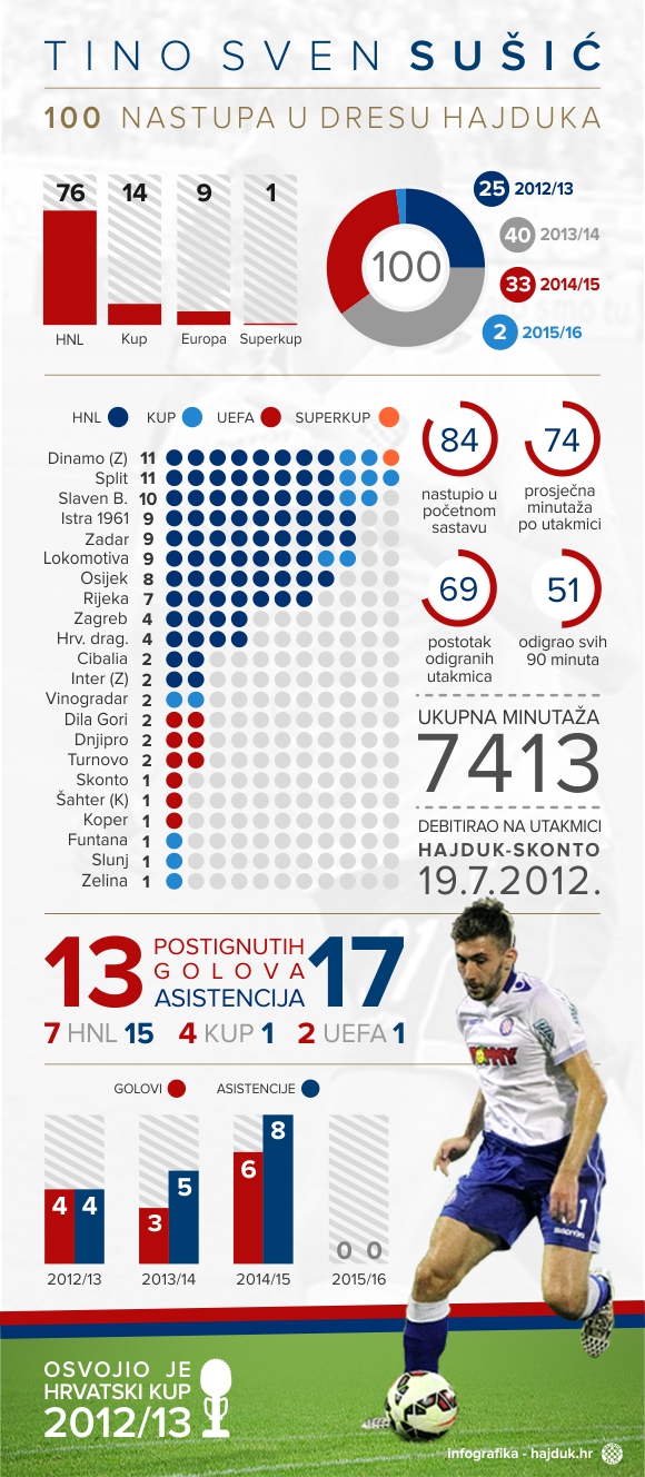 Tino Sven Sušić svoj prvi nastup za Hajduk imao je 19. srpnja 2012. godine u europskoj pobjedi 2:0 protiv Skonta iz Rige na Poljudu.