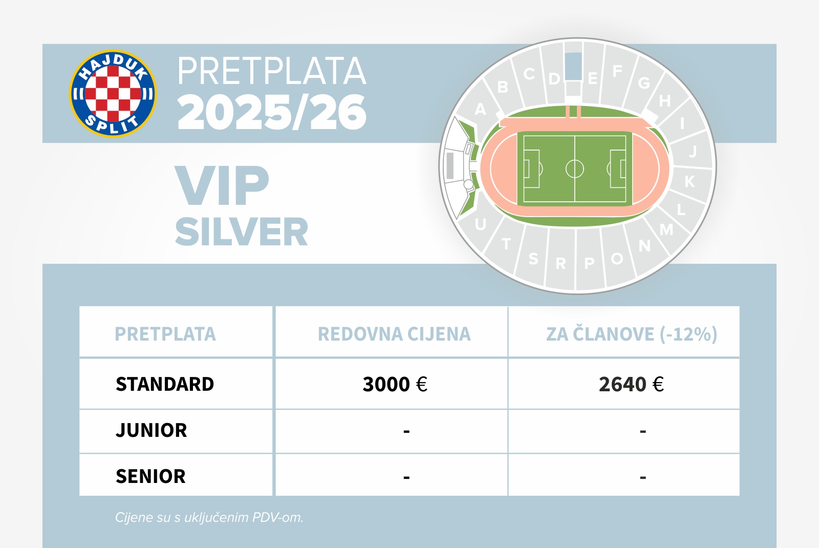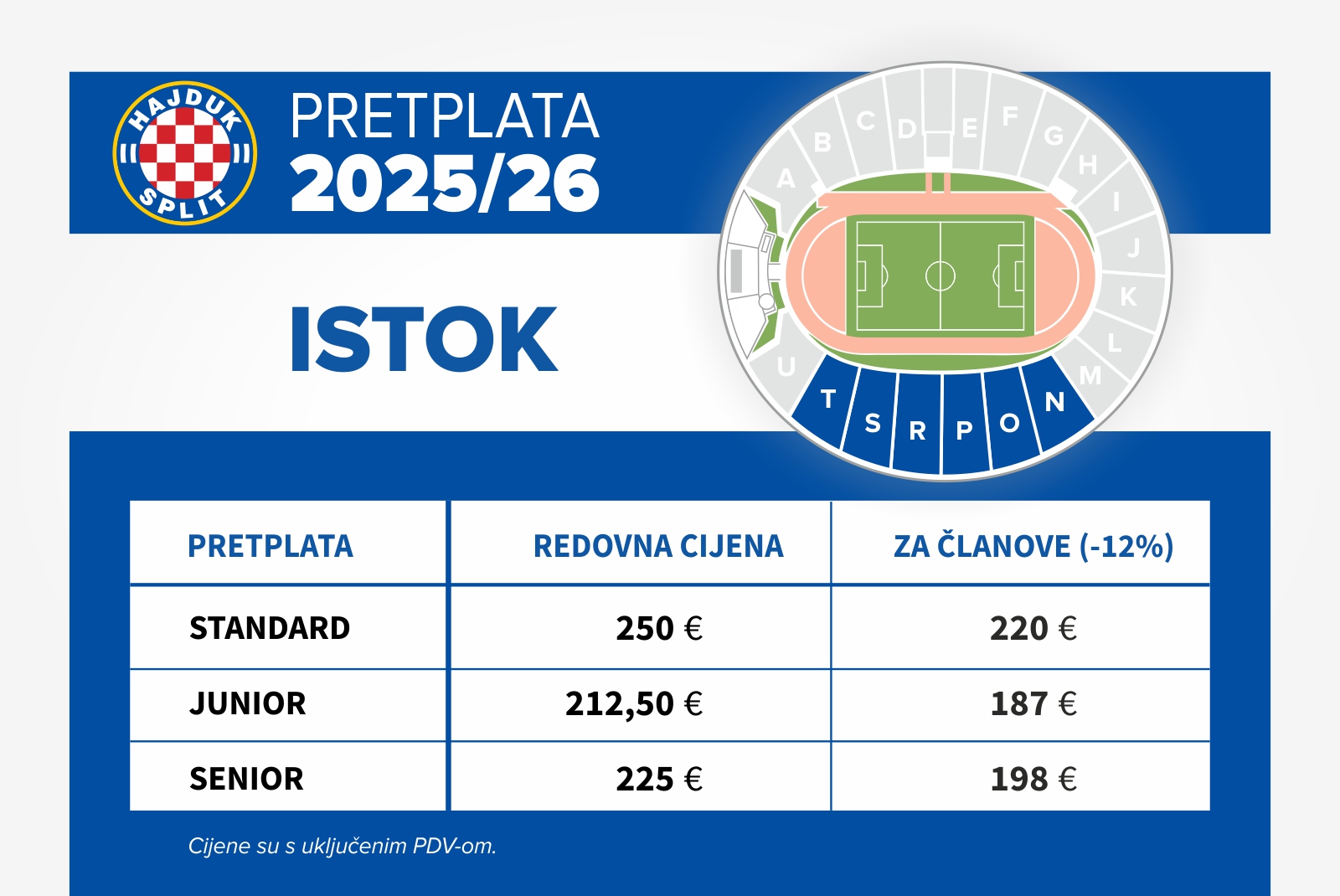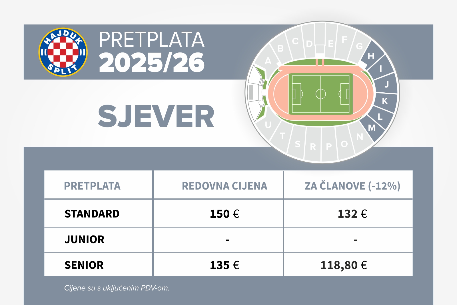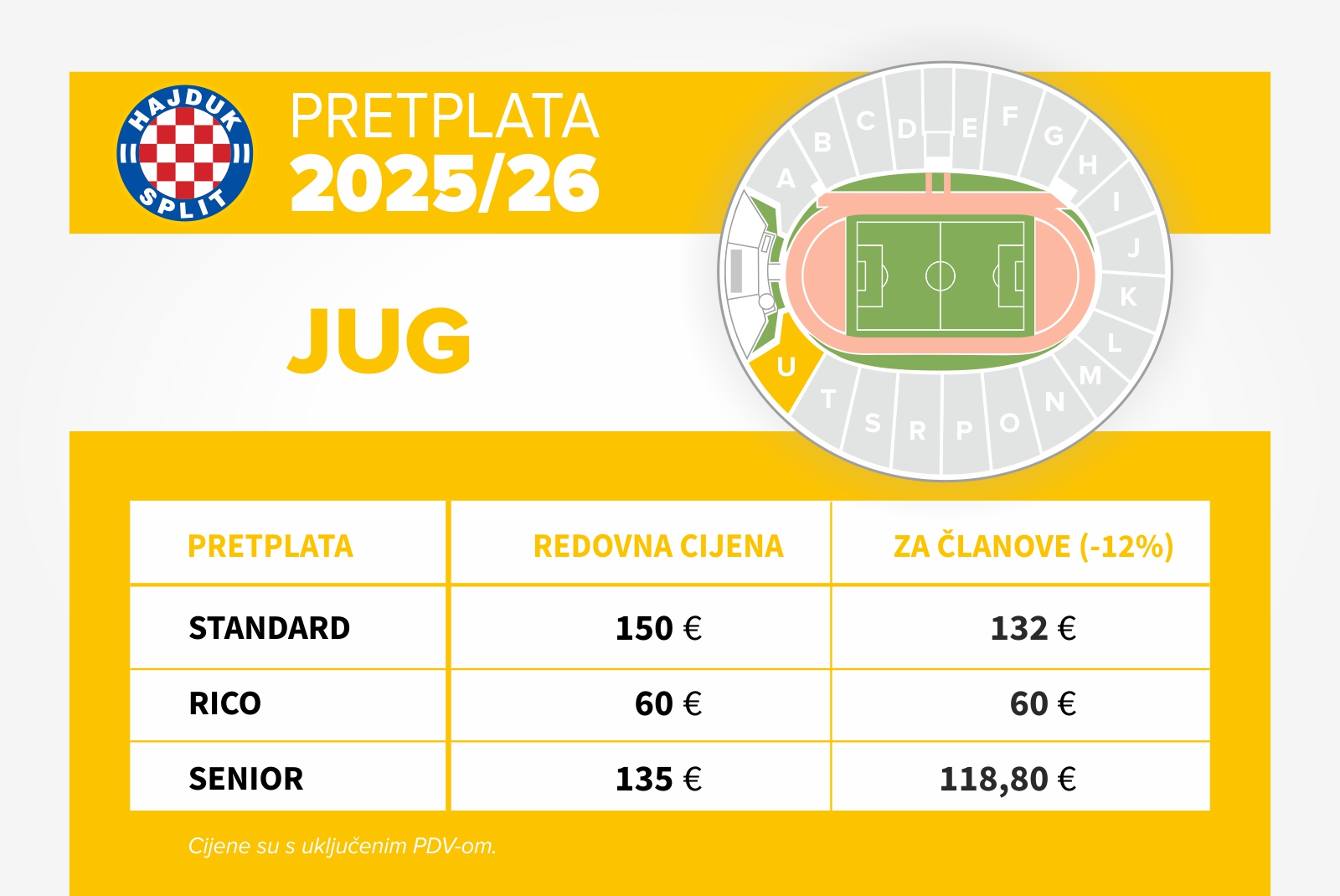 Kupnjom sezonske pretplate osiguravate mjesto za sve utakmice SuperSport Hrvatske nogometne lige, 2. i 3. pretkolo UEFA Konferencijske lige te za utakmice SuperSport Hrvatskog nogometnog kupa (osim finala) koje se u organizaciji HNK Hajduk Split održavaju na Poljudu, u natjecateljskoj sezoni 2025./2026.