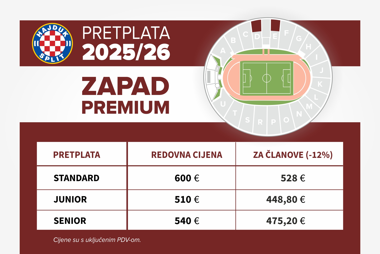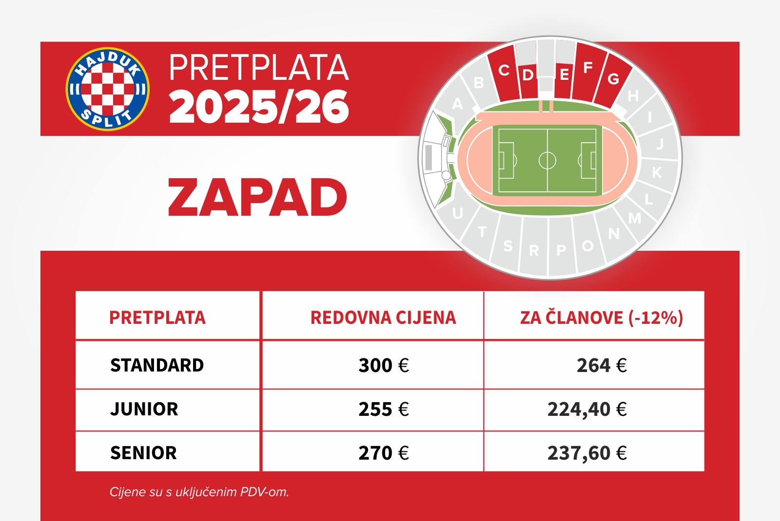 U ponedjeljak, 23. lipnja od 10 sati kreće prodaja sezonskih pretplata za natjecateljsku sezonu 2025./2026. Prva dva tjedna, od 23. lipnja do 7. srpnja traje razdoblje u kojem prošlosezonski pretplatnici mogu obnoviti svoje pretplate te imaju mogućnost promijeniti svoje mjesto za mjesta koja su u tom trenutku dostupna. U istom razdoblju, postojeći pretplatnici mogu, osim mjesta, promijeniti i tribinu birajući mjesta koja su dostupna na drugoj tribini.